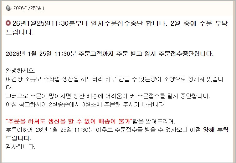 "현재 1월 24일 25일 주문하신 고객님들 상품도 2월 20일에서 30일 이상 배송지연 됩니다." "사전 주문하신 고객님들 상품이 생산 배송 된 후 다시 주문접수를 재개하겠습니다" "먼저 24일 주문고객님들 주문상품을 순차적으로 생산하여 배송하여 드리겠습니다. 접수순에 따라 1~2주 이상 소요됩니다. 최선을 다해 보내드리도록 하겠습니다. 이후 25일 주문고객님들 상품 생산하여 보내드립니다. 예상기간은 2~3주 이상 기다리셔야 합니다. 최선을 다하여 만들어 보내드리겠습니다." |