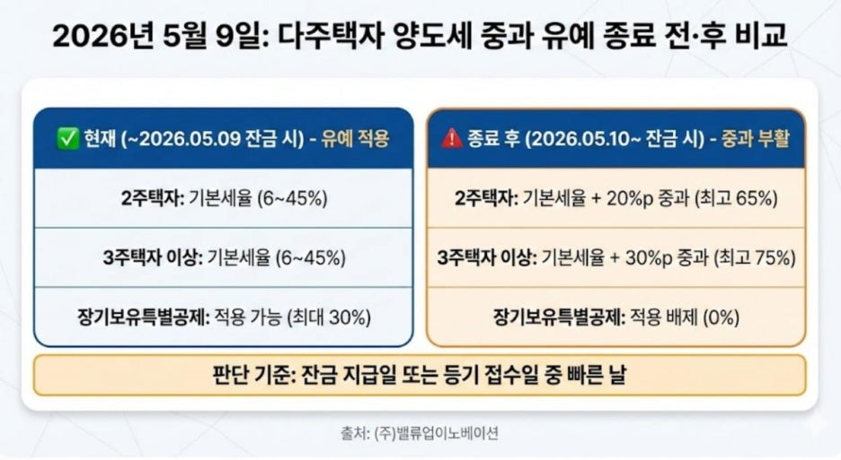 2026년 5월 9일 다주택자 양도세 중과 유예가 종료됩니다. 이재명 대통령의 연장 불가 발표로 부동산 시장의 큰 변화가 예상되는데요, 다주택자라면 반드시 알아야 할 세금 폭탄과 대응 전략을 쉽게 설명해드립니다.