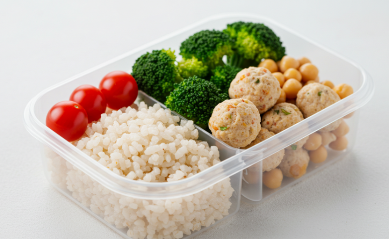 - 재료: 곤약밥 1팩, 데친 브로콜리, 방울토마토, 닭가슴살볼 또는 병아리콩