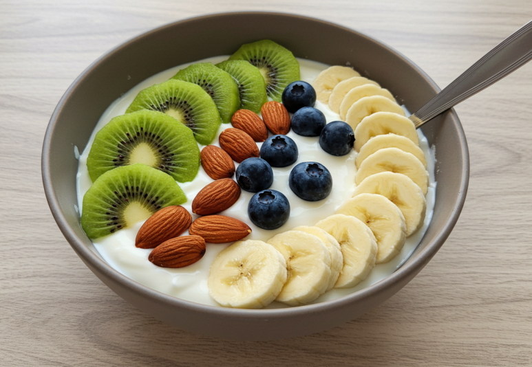 - 재료: 플레인 그릭요거트 150g, 키위·블루베리·바나나 등 과일, 아몬드, 꿀