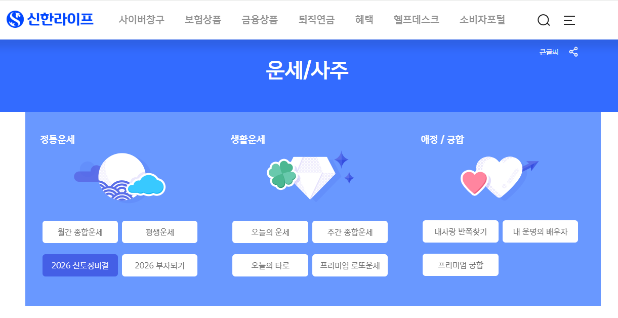신한생명에서 운영하는 운세 사이트로, 연중 내내 이용 가능해요! 2026년 신년운세는 물론이고 오늘의 운세, 주간운세, 토정비결까지 다양하게 볼 수 있답니다.