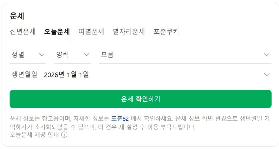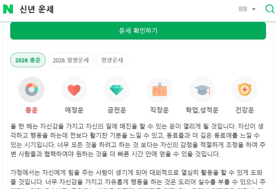 이용 방법: 네이버 검색창에 "네이버 신년운세" 또는 "2026 신년운세" 검색하면 바로 나와요. 로그인도 필요 없고 생년월일만 입력하면 끝!