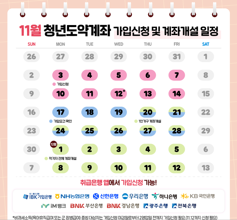 11월 14일까지 신청해야12월에 계좌를 개설할 수 있으니, 조건에 해당하는 청년이라면 서둘러 신청하시기 바랍니다!