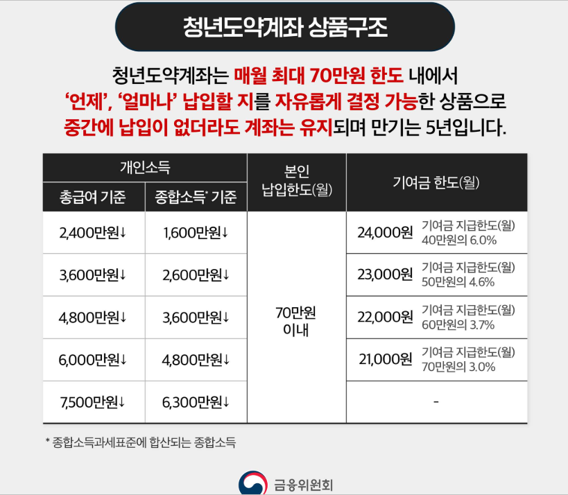 ⚠️ 2025년 1월부터 개정: 소득구간 관계없이 월 70만 원까지 납입 시 정부 기여금 지급 (기존에는 소득에 따라 납입 한도 제한) 5년 총 지원금: 최대 198만 원 (저소득 청년 기준)