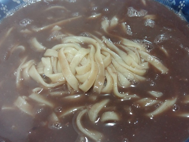 팥물에 새알심, 쌀 대신 칼국수 면을 넣어 만듭니다.