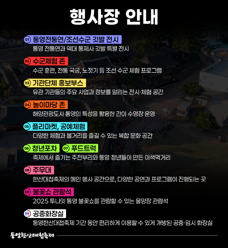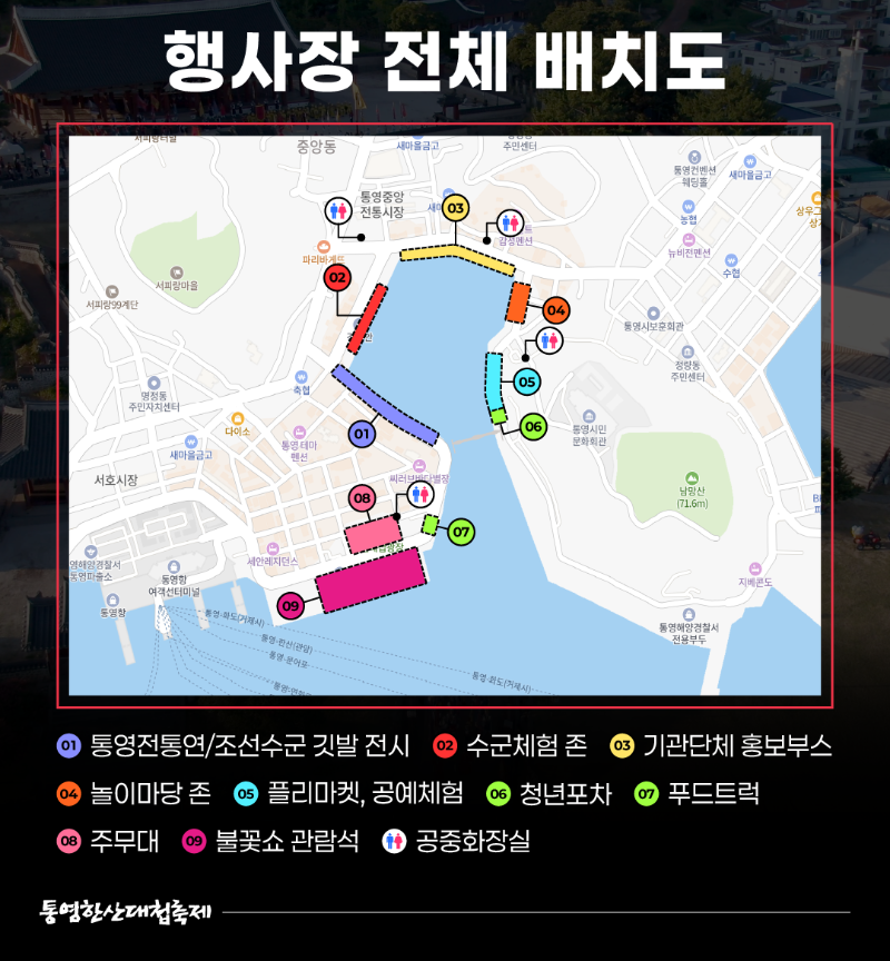 • 장소: 통영한산대첩광장, 강구안 문화마당, 이순신공원, 무전대로 등 통영시 일원놓치면 안 되는 하이라이트 프로그램